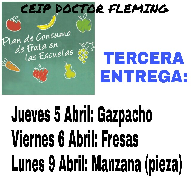 Esta semana tendrá lugar el reparto a todo el alumnado del centro de la 3ª entrega del Plan de consumo de frutas y verduras en la escuela, el cual tiene como finalidad promover el consumo de frutas y verduras en la población escolar. Plan que forma parte del PROGRAMA HÁBITOS DE VIDA SALUDABLE: CRECIENDO EN SALUD.